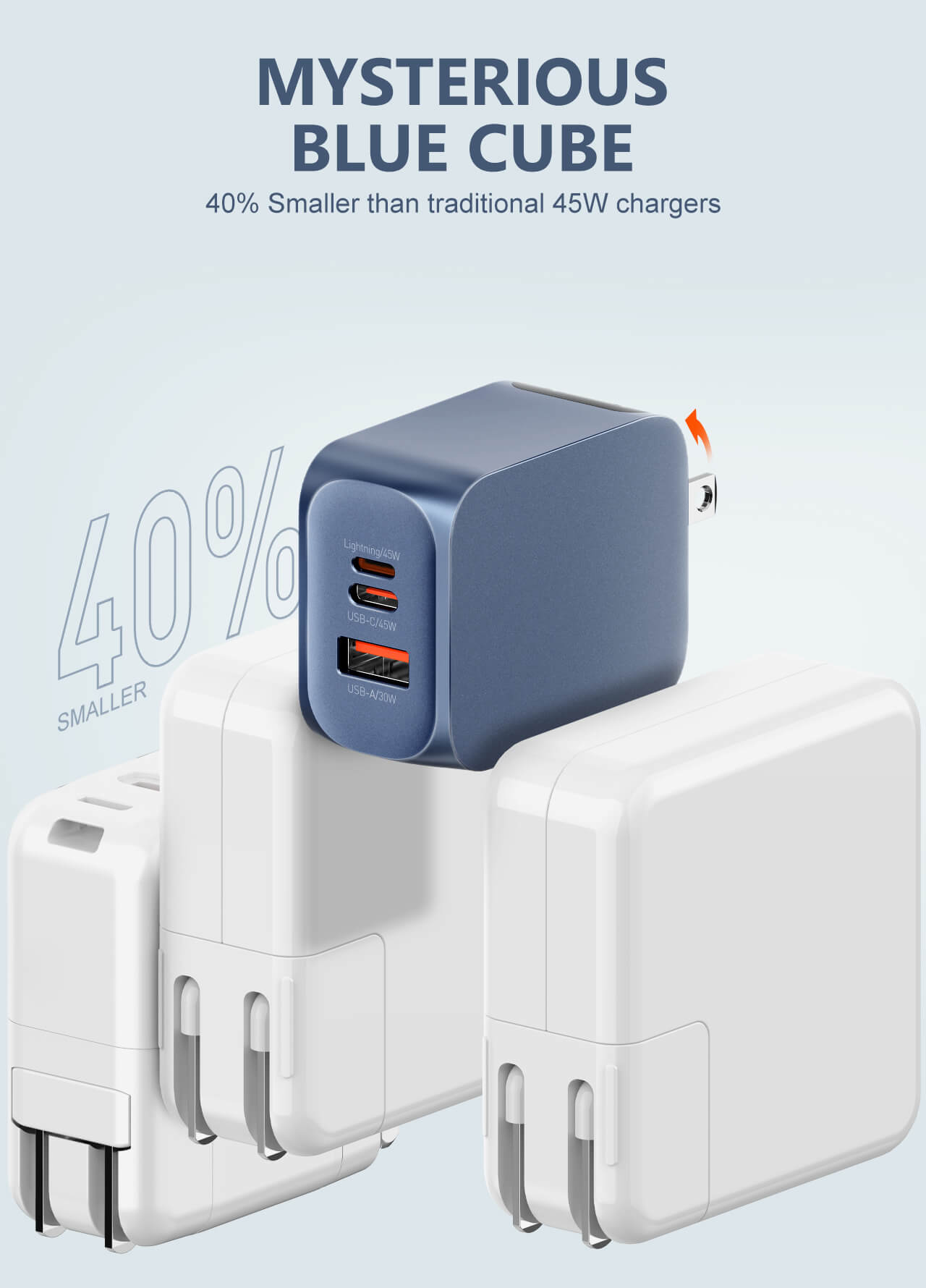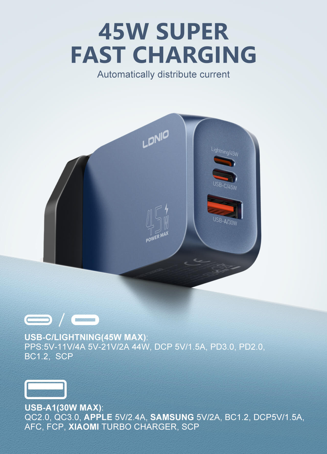 Equipped with USB-C PD3.0 and USB-A QC3.0 technologies, this charger delivers up to 45 watts of total power output, enabling ultra-fast charging for your devices.