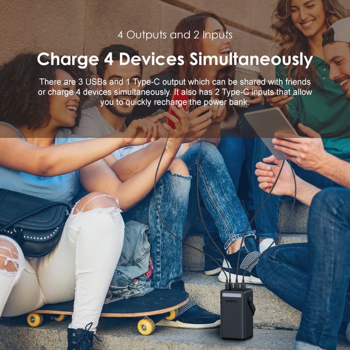 There are 3 USB outputs and 1 Type-C output which can be shared with friends or charge 4 devices at the same time. It is with 2 Type-C inputs allow you to recharge this power bank quickly.