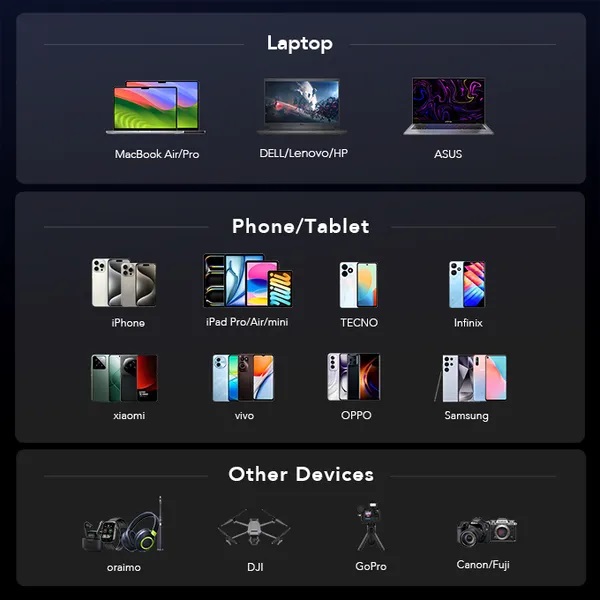 *Oraimo PowerJet 130 Power Bank is compatible with more than 1,000 major devices, including Apple, SAMSUNG, Tecno, Infinix and Mi smartphones and Type-C port charging Laptops such as MacBook Pro 13″/ MacBookPro 14″ / MacBook Pro 15″/MacBook Pro 16″/MacBook Air Series; HP Spectre/ Zbook; Google Pixelbook; Dell/Google Pixelbook/Microsoft Suface Book/ThinkPad and more.