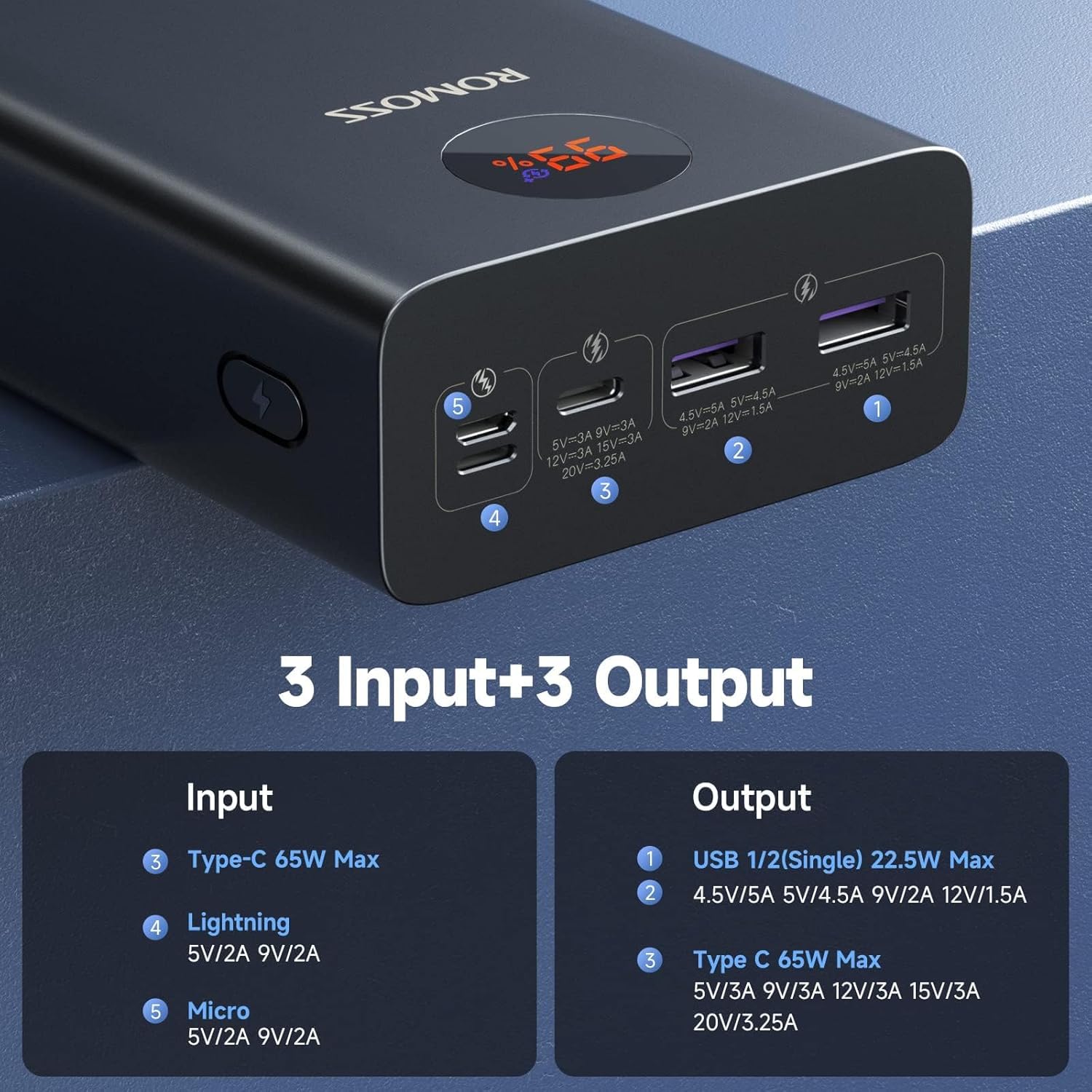 Equipped with USB-C, 2 × USB-A outputs, and Micro, Lightning, USB-C inputs, this power bank lets you charge up to three devices at once. Perfect for families, content creators, and multitaskers.