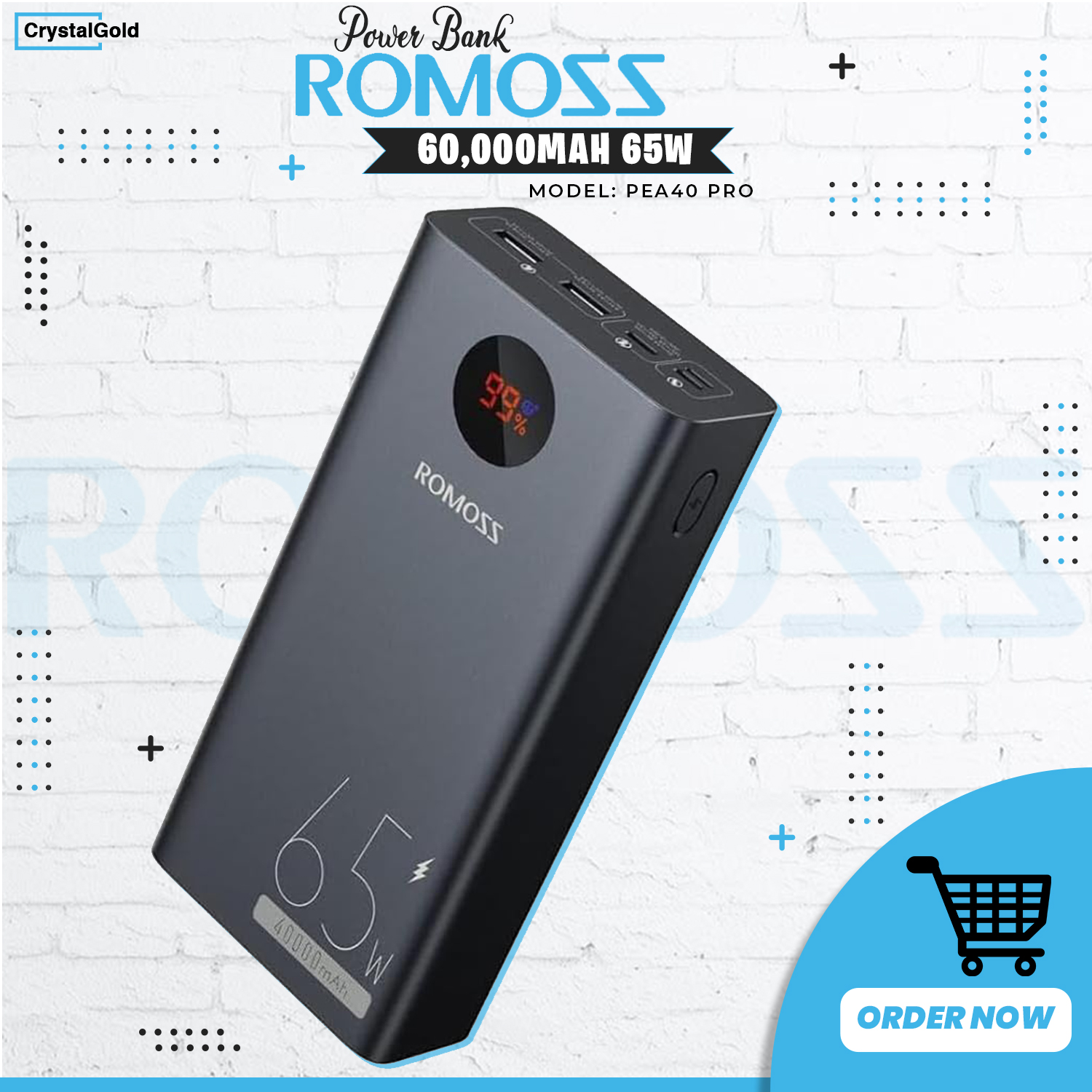 Stay connected anywhere with the ROMOSS 40000 mAh 65 W Fast Charging Power Bank, available exclusively at Crystalgold Ecom.
